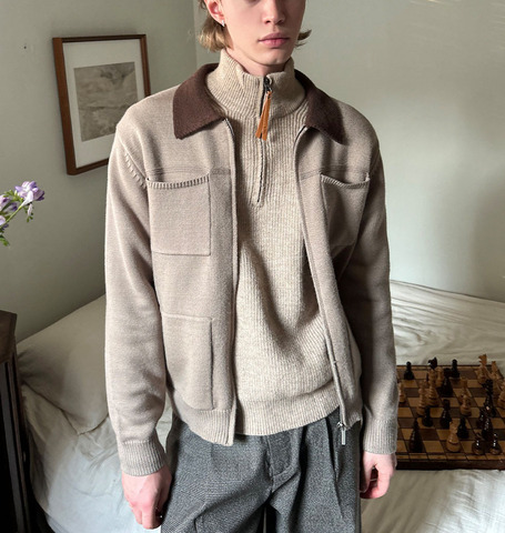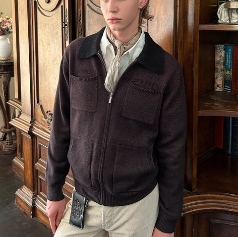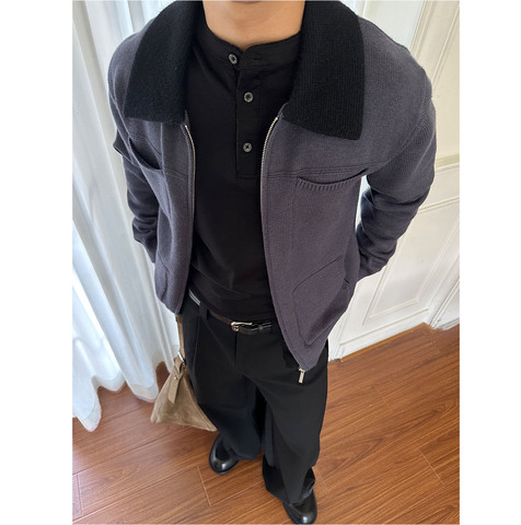 Color sólido de punto Otoño/Invierno manga larga viejo dinero hombres Polo cuello suéter Top desgaste Vintage suelto Casual media cremallera suéter